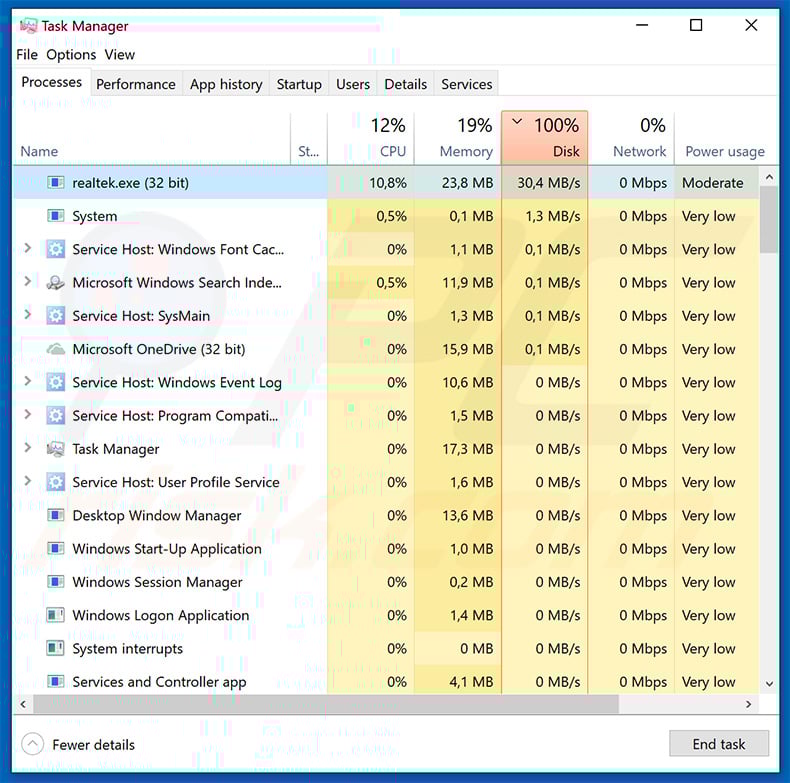 Screenshot of the BSC process ("realtek.exe"). Note that Realtek is a legitimate company, which manufactures various microchips - criminals attempt to disguise the malicious process using the realtek.exe name in Windows Task Manager: