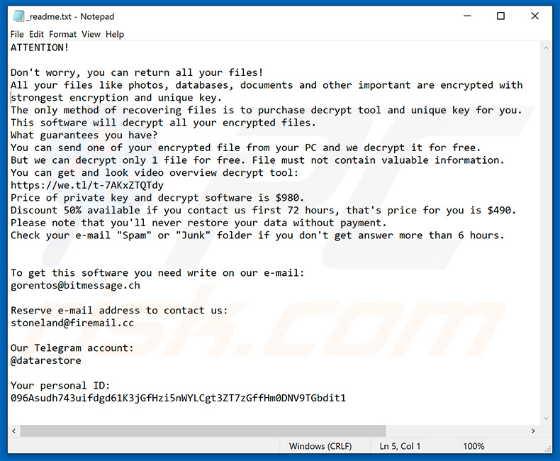 Therefore, to receive the key and decrypt data, each victim must pay a ransom of $980. To receive payment/decryption instructions, victims must contact criminals via an email address provided or telegram. The message also states that victims will receive a 50% discount (the cost will drop to $490) if they make contact within 72 hours of encryption.