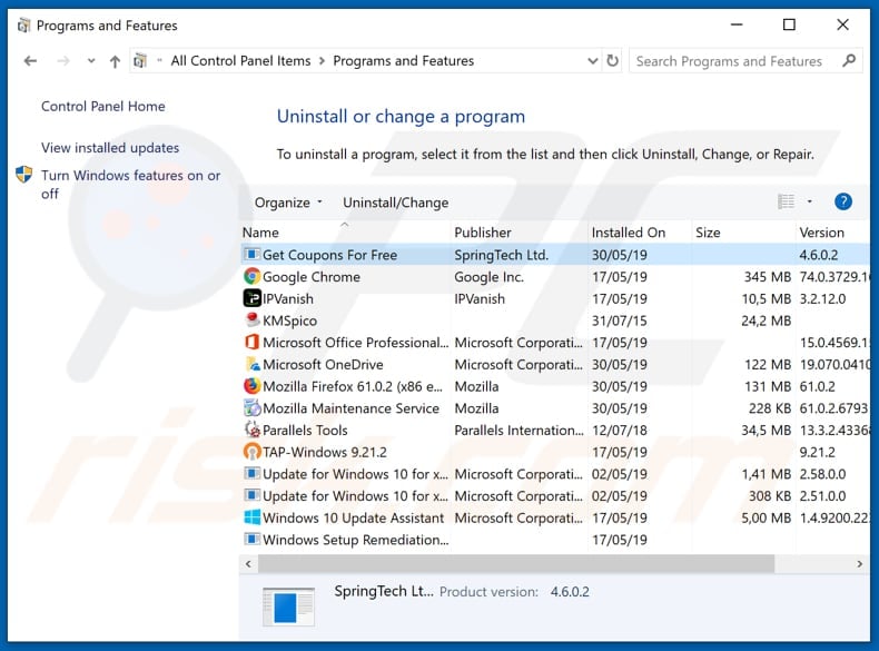 In the uninstall programs window: look for any recently installed suspicious applications (for example, "Get Coupons For Free"), select these entries and click "Uninstall" or "Remove".