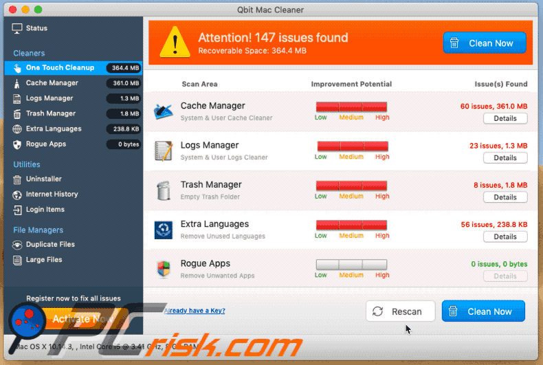 Qbit Mac Cleaner is a potentially unwanted application (PUA) that supposedly fixes and cleans Mac computers. Developers offer similar tools such as a Cache Manager, Logs Manager, and Trash manager, Rogue App Uninstaller, Browsing History Cleaner, and so on.