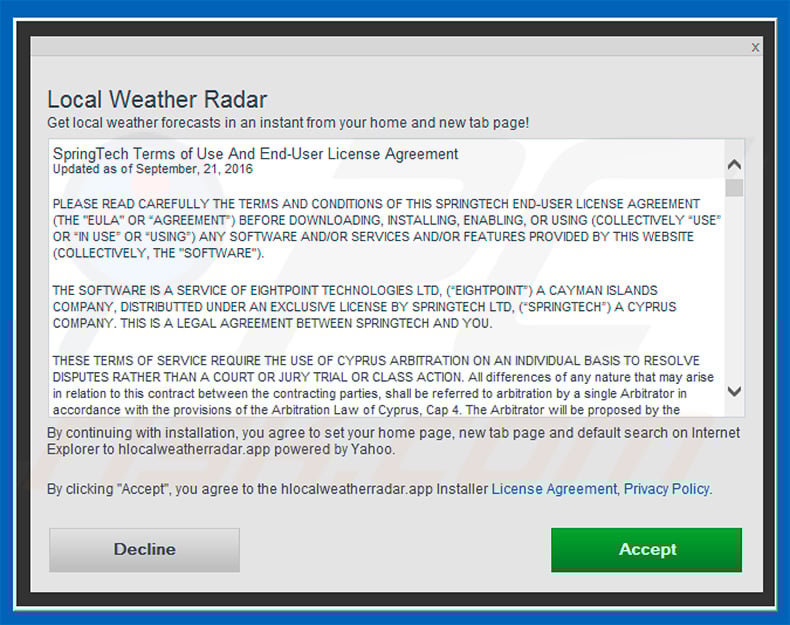 Local Weather Radar is free for anyone to download on its official website, however, this application usually infiltrates computers without users' consent, since developers proliferate it using "bundling" and intrusive advertising methods. "Bundling" is essentially stealth installation of third party applications together with regular software.