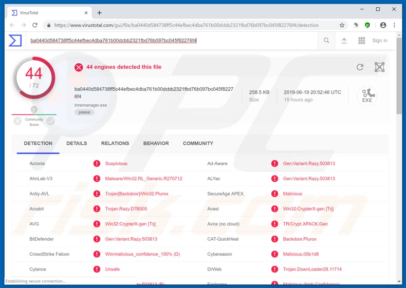 Avast (Win32:CrypterX-gen [Trj]), BitDefender (Gen:Variant.Razy.503813), ESET-NOD32 (A Variant Of Win32/Kryptik.GPSF), Kaspersky (HEUR:Trojan.Win32.Generic), Full List (VirusTotal) |