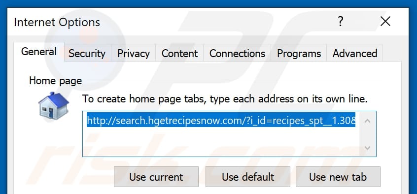 (at the top right corner of Internet Explorer), select "Internet Options", in the opened window, remove hxxp://search.hgetrecipesnow.com and enter your preferred domain, which will open each time you launch Internet Explorer. You can also enter about: blank to open a blank page when you start Internet Explorer.