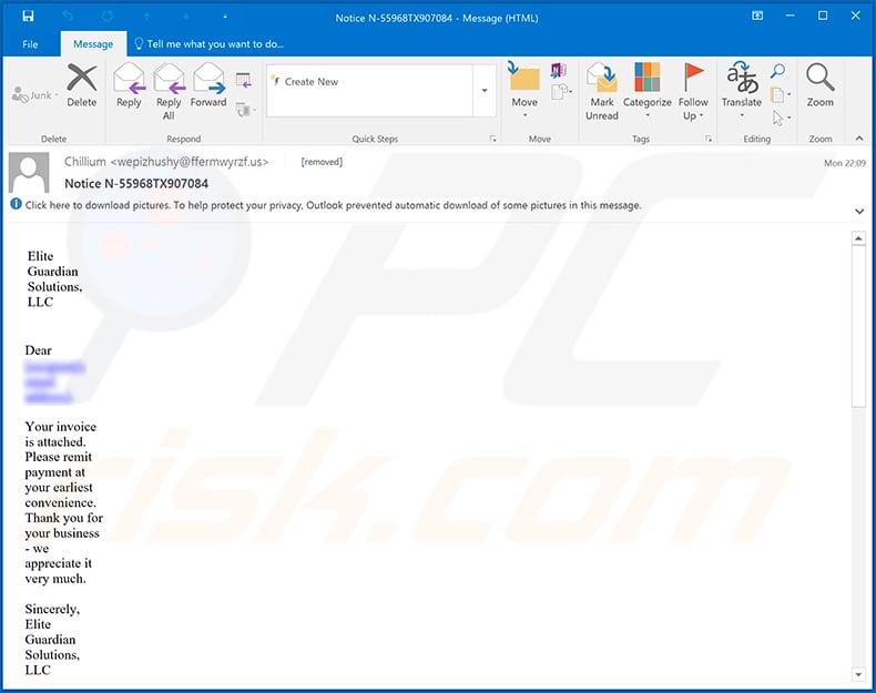 Research shows that cyber criminals poliferate Dridex through spam campaigns. They send emails that contain attached Microsoft Word or Excel files. Typically, these emails are presented as official and important. In our example, the email is disguised as a message regarding an invoice.