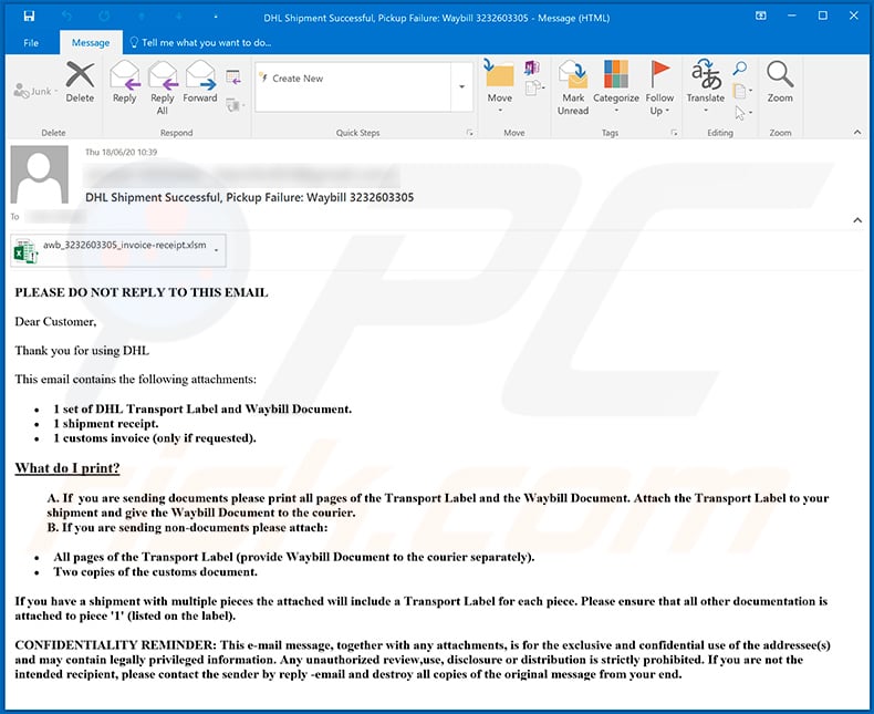 Example of a DHL-themed spam email used to distribute Dridex malware: