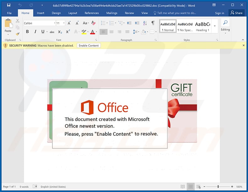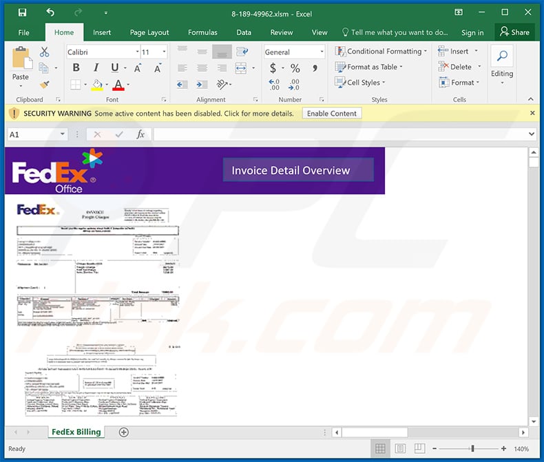 The main purpose of this spam campaign is to trick people into opening the attached file, which then causes download and installation of a malicious program. In this case, an MS Office file infects computers with Dridex. Typically, these files demand permission to enable macro commands (thus allowing content/editing).