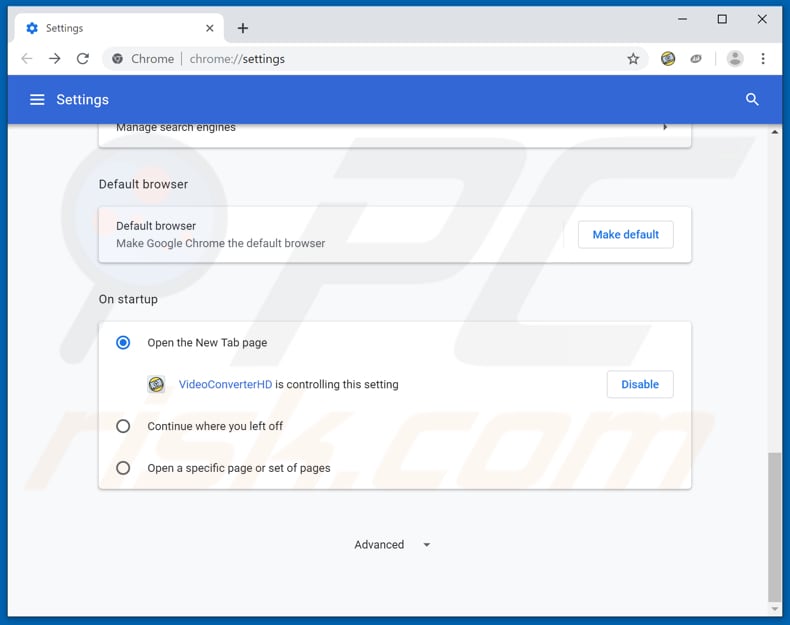 (at the top right corner of Google Chrome), select "Settings". In the "On startup" section, disable "VideoConverterHD", look for a browser hijacker URL (hp.myway.com) below the “Open a specific or set of pages” option. If present, click on the three vertical dots icon and select “Remove”.