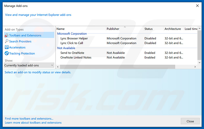 (at the top right corner of Internet Explorer), select "Manage Add-ons". Look for any recently installed suspicious extensions, select these entries and click "Remove".