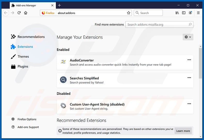 (at the top right corner of the main window), select "Add-ons". Click on "Extensions" and remove "Quick Audio Converter Pro" (or simply "AudioConverter"), as well as all other recently installed browser plug-ins.