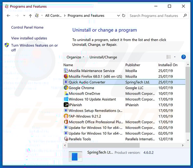 In the uninstall programs window: look for any recently installed suspicious applications (for example, "Quick Audio Converter Pro"), select these entries and click "Uninstall" or "Remove".