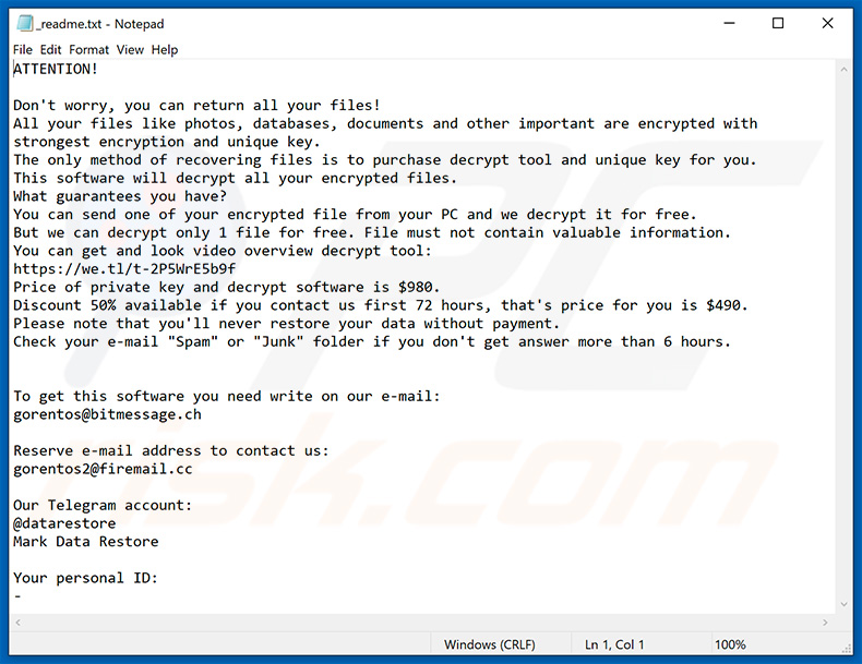All keys are stored on a remote server controlled by cyber criminals. Therefore, to receive their key, each victim must contact these people via email/telegram and pay the ransom. The cost of each key is equivalent to $980, however, victims who contact these people within 72 hours of encryption will supposedly receive a 50% discount, and thus the cost drops to $490.