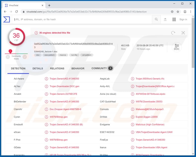 | Detection Names (53949248_facture-1.doc) | Arcabit (Trojan.Generic.D276ECFE), BitDefender (Trojan.GenericKD.41348350), ESET-NOD32 (VBA/TrojanDownloader.Agent.OAW), Kaspersky (HEUR:Trojan-Downloader.MSOffice.SLoad.gen), Full List (VirusTotal) |