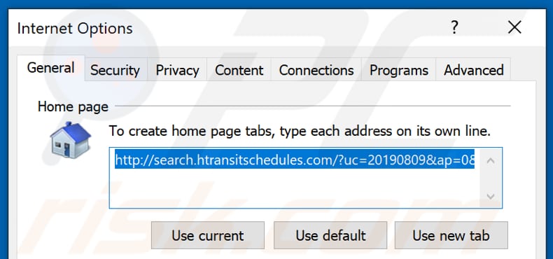 (at the top right corner of Internet Explorer), select "Internet Options", in the opened window, remove hxxp://search.htransitschedules.com and enter your preferred domain, which will open each time you launch Internet Explorer. You can also enter about: blank to open a blank page when you start Internet Explorer.