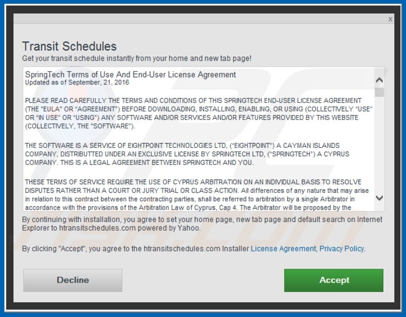 Transit Schedules changes browser settings to promote a fake search engine (search.htransitschedules.com) and records information relating to users' browsing habits. Transit Schedules is categorized as a potentially unwanted application (PUA), since people usually download and install it unintentionally.