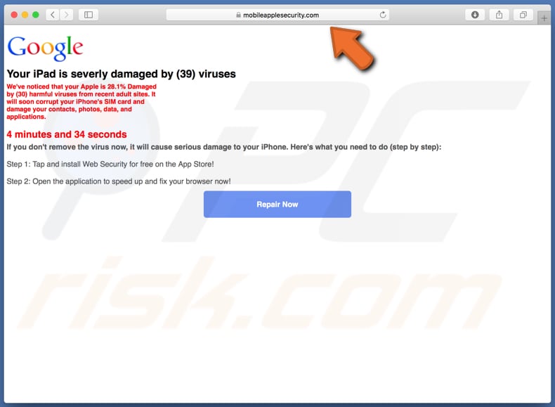 Unless these viruses are removed immediately, it states that they will seriously damage the iPhone (or iPad). To remove them, visitors are encouraged to click the "Repair Now" button, which opens an App Store link. This is the download page of the Web Security Checker app, however, mobileapplesecurity[.]com might also be used to advertise other applications.