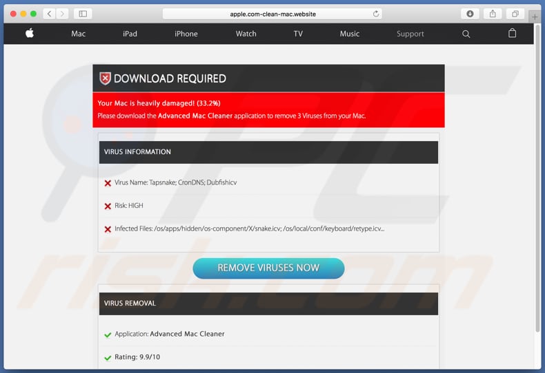 apple.com-clean-mac[.]website is one of many deceptive websites that informs victims of viruses that they have supposedly detected on visitors' computers. The main goal of these sites is to trick people into installing a dubious app that will apparently remove the viruses.