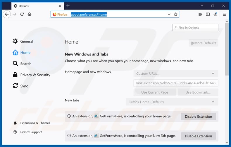 (at the top right corner of the main window), then select "Options", in the opened window, disable GetFormsHere, remove hxxp://hp.myway.com and enter your preferred domain, which will open each time you start Mozilla Firefox.