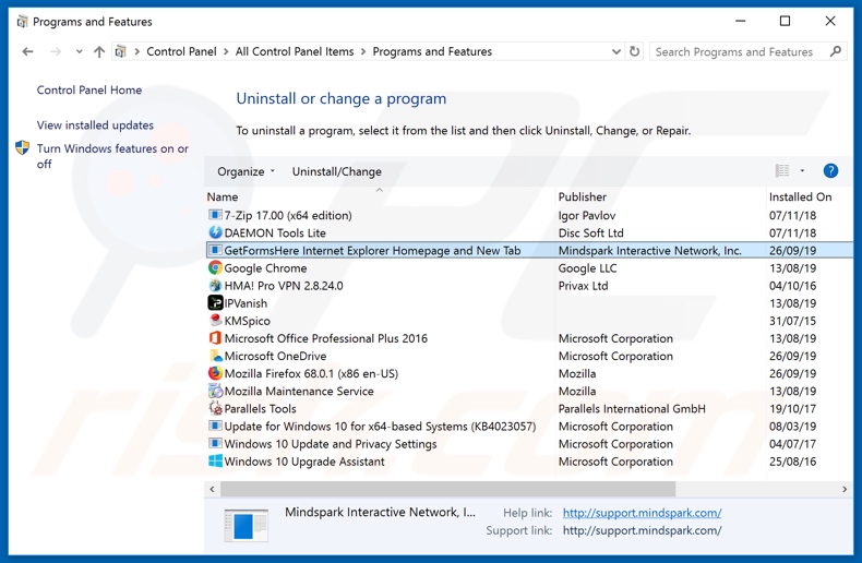 In the uninstall programs window: look for any recently installed suspicious applications (for example, "GetFormsHere Internet Explorer..."), select these entries and click "Uninstall" or "Remove".