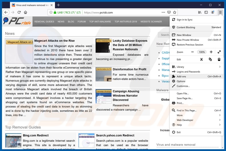 (at the top right corner of the main window), select "Add-ons". Click "Extensions", in the opened window, remove all recently-installed suspicious browser plug-ins.