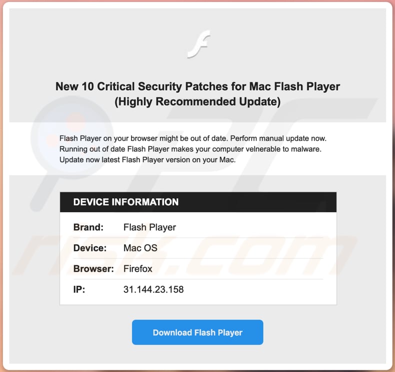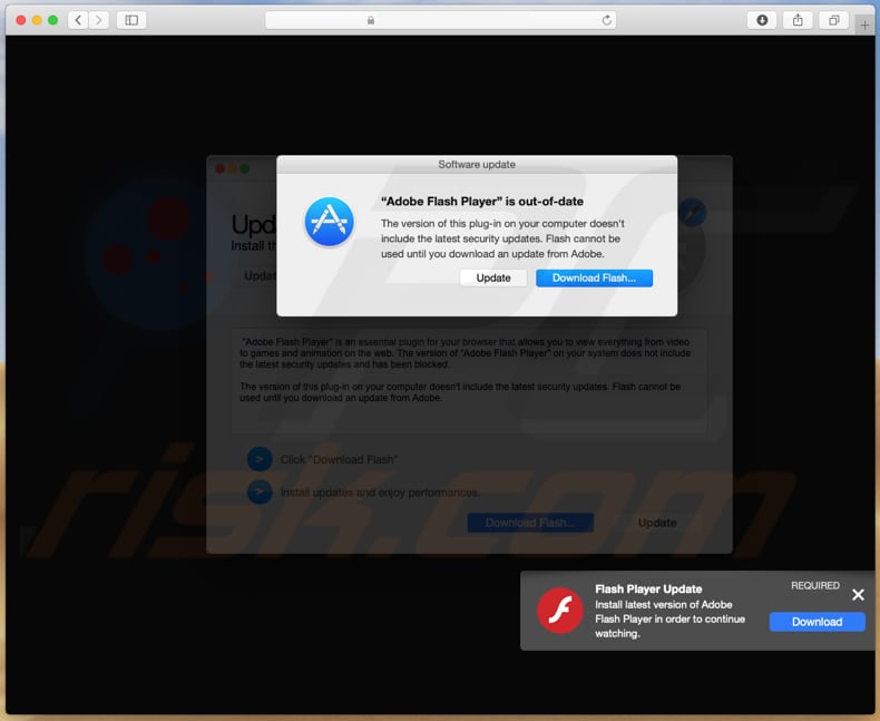 Tarmac is distributed through OSX/Shlayer.D, another malware infection that installs it through an 'installer' disguised as an installer/updater of Adobe Flash Player. Research shows that OSX/Shlayer.D is distributed through various deceptive web pages, which inform visitors that the installed Adobe Flash Player is out-of-date.