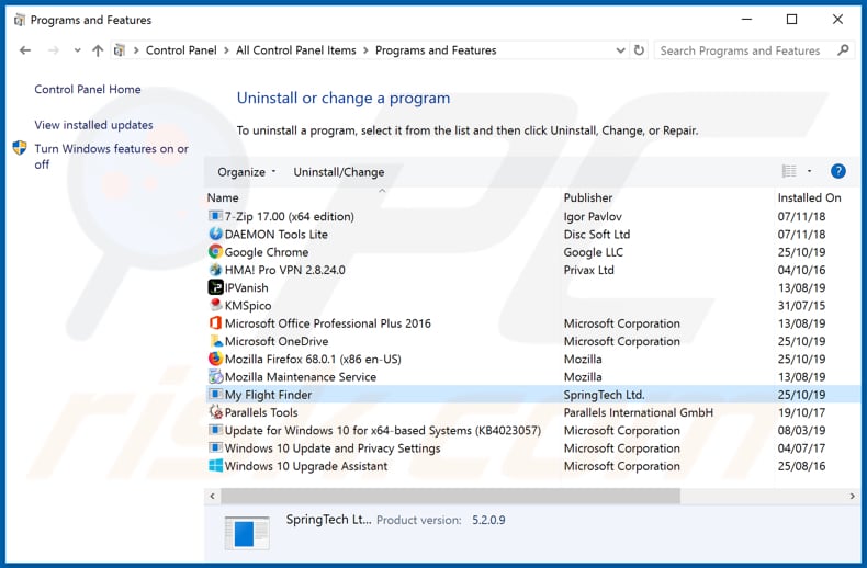 In the uninstall programs window: look for any recently installed suspicious applications (for example, "My Flight Finder"), select these entries and click "Uninstall" or "Remove".
