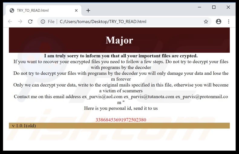 The message within the "TRY_TO_READ.HTML" file contains identical text to the wallpaper, however, it adds that only they (the developers of Major) can decrypt the compromised files. Victims are told not to attempt decryption with the aid of third parties, since they will be scammed.