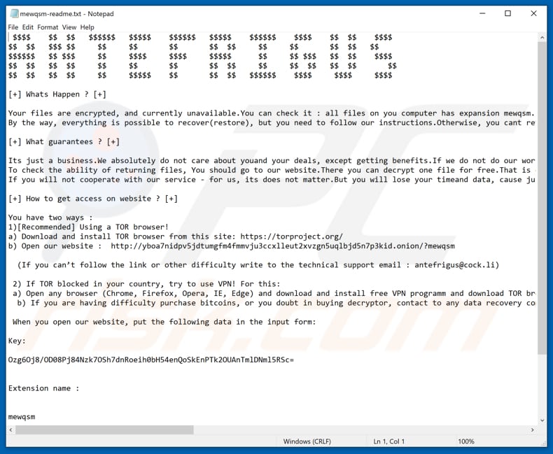 | Ransom Demanding Message | mewqsm-readme.txt (its name depends on the pre-pended extension). |