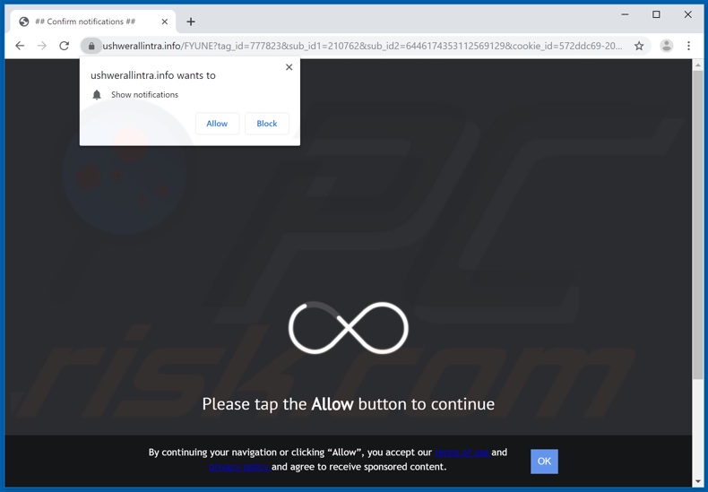 Furthermore, this website employs browser notifications, the consent option to which it disguises within 'clickbait' ("Please tap the Allow button to continue"). If consent to notifications is given, ushwerallintra[.]info begins running ad campaigns.