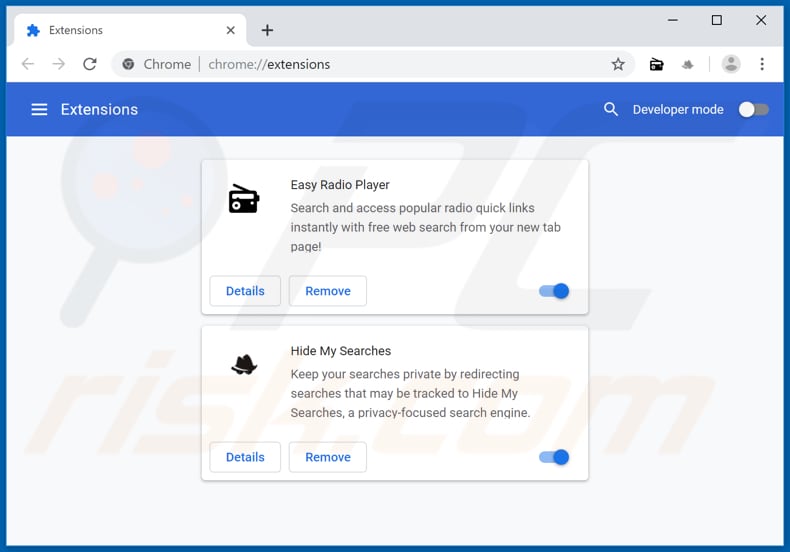 (at the top right corner of Google Chrome), select "More tools" and click "Extensions". Locate "Easy Radio Player" and other recently-installed suspicious browser add-ons (e.g., "Hide My Searches"), and remove them.