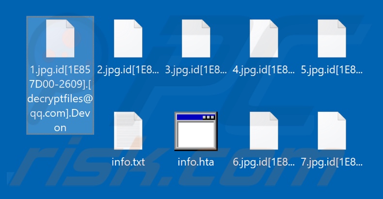 For example, a filename like "1.jpg" might appear as something similar to "1.jpg.id[1E857D00-2609].[decryptfiles@qq.com].Devon", and so on for all affected files. Once this process is complete, Devon malware stored the "info.hta" and "info.txt" files on the desktop. Both the HTML application and text file contain ransom messages.