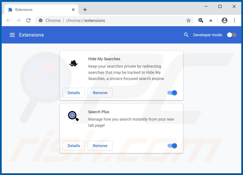 (at the top right corner of Google Chrome), select "More tools" and click "Extensions". Locate "Search Plus" and other recently-installed suspicious browser add-ons (e.g., "Hide My Searches"), and remove them.