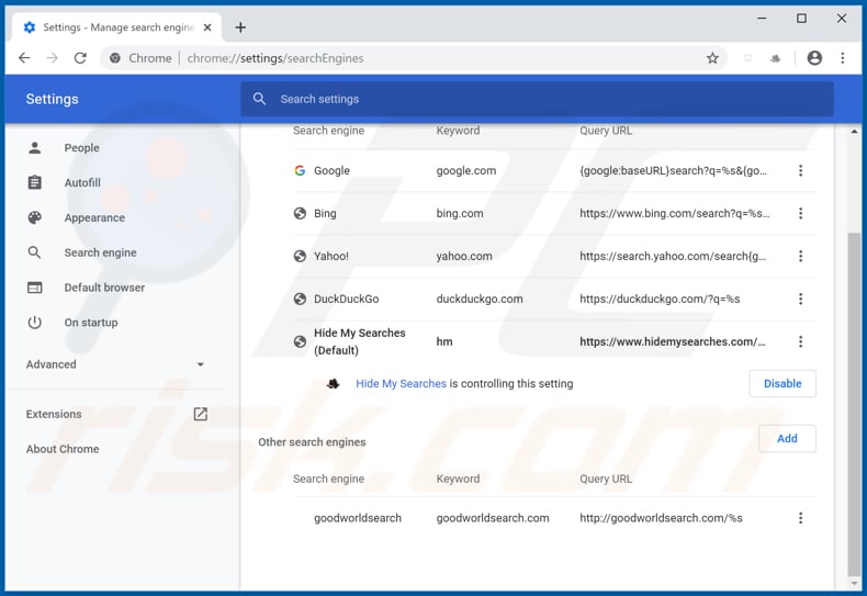 (at the top right corner of Google Chrome), select "Settings", in the "Search engine" section, click "Manage search engines...", in the opened list look for "hxxp://search.onlinetvstreamsapptab.com" and "hxxp://hidemysearches.com", when located click the three vertical dots near this URL and select "Remove from list".