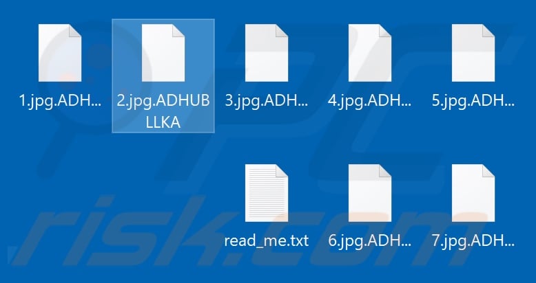 For example, a file originally named "1.jpg" would appear as "1.jpg.ADHUBLLKA" following encryption, and so on for all affected files. After this process is complete, a text file ("read_me.txt") containing the ransom message is created on the desktop.