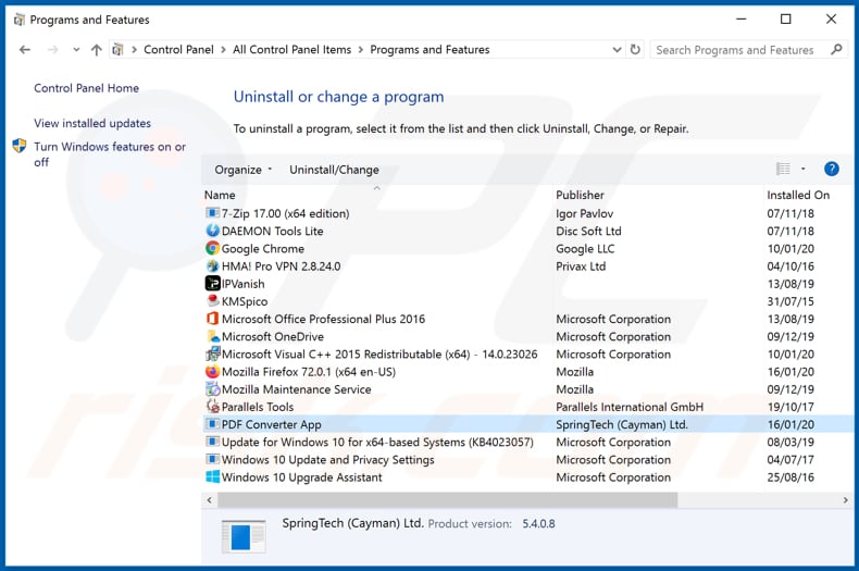In the uninstall programs window: look for any recently installed suspicious applications (for example, "PDF Converter App"), select these entries and click "Uninstall" or "Remove".