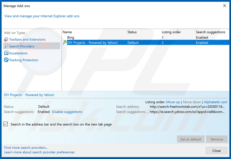 (at the top right corner of Internet Explorer), select "Manage Add-ons". In the opened window, select "Search Providers", set "Google", "Bing", or any other preferred search engine as your default and then remove "DIY Projects".