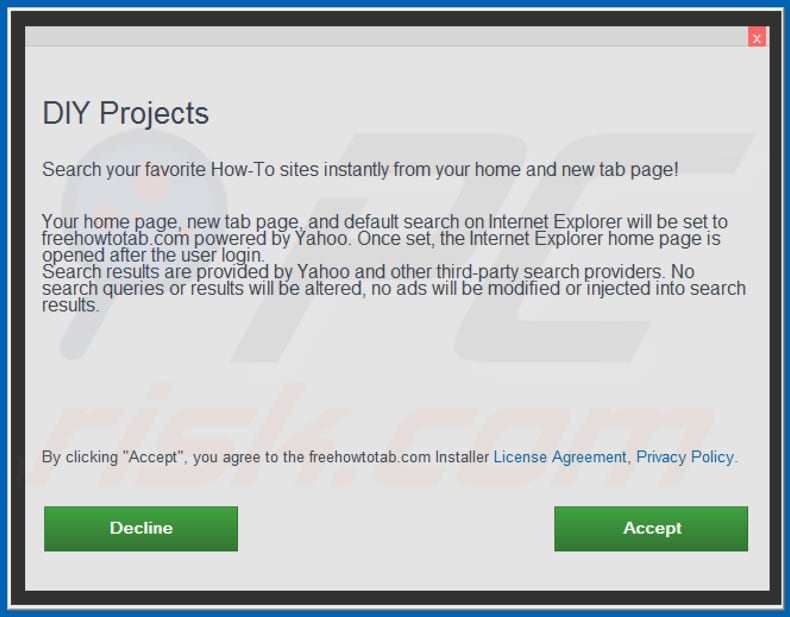 DIY Projects supposedly provides links to popular how-to websites, however, this app is classified as a browser hijacker, since it promote a fake search engine (search.freehowtotab.com) by changing certain browser settings. Browser hijackers can also record user-system information - in most cases, they target browsing data.