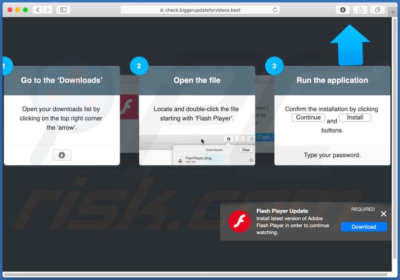 biggerupdateforvideos[.]best is a deceptive website used to trick visitors into installing unwanted software through a fake Adobe Flash Player installer. Research shows that biggerupdateforvideos[.]best downloads a file that installs two potentially unwanted applications (PUAs): Advanced Mac Tuneup and SearchItNow.
