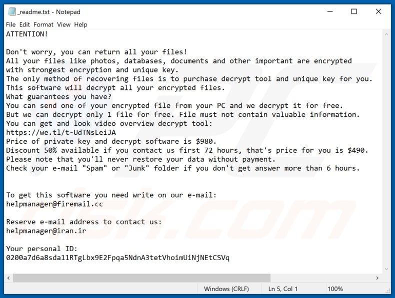 Before paying, victims can test decryption by sending the cyber criminals responsible for the infection one encrypted file (this file cannot contain valuable information). The cost of decryption tools/keys is $980, however, should users contact the criminals within the first 72 hours, the ransom is reduced by 50% (to $490).