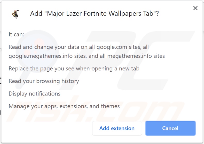 Major Lazer Fortnite Wallpapers Tab browser hijacker asking for various permissions: