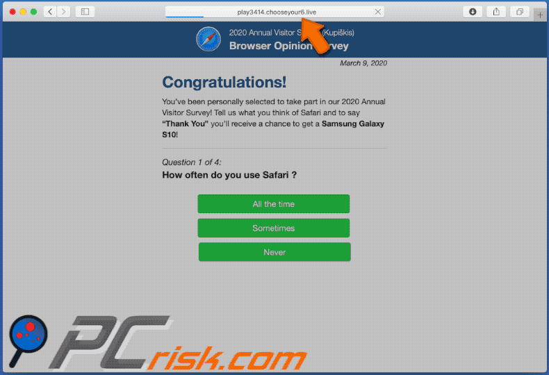 "Chooseyour" is a group of deceptive websites, promoting various online scams. They have been observed running "Latest version of Adobe Flash Player" schemes (which promote bogus updaters) and "Dear Safari User, You Are Today's Lucky Visitor" (which offers fake prizes).