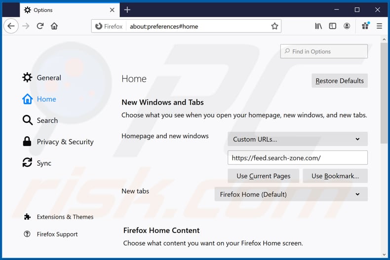 (at the top right corner of the main window), then select "Options", in the opened window disable "SearchZone", remove hxxp://feed.search-zone.com and enter your preferred domain, which will open each time you start Mozilla Firefox.