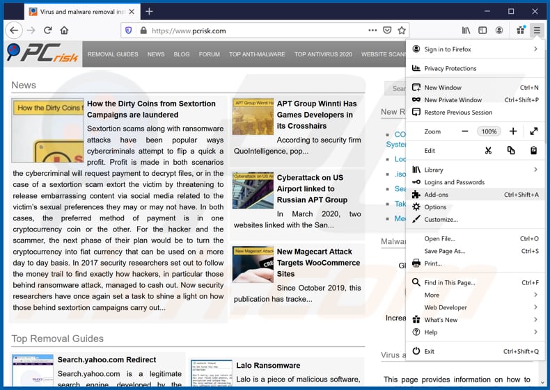(at the top right corner of the main window), select "Add-ons". Click "Extensions", in the opened window, remove all recently-installed suspicious browser plug-ins.