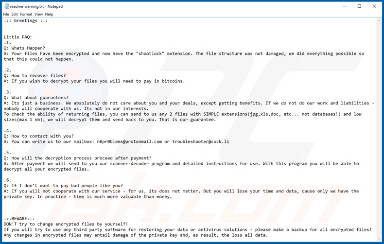 Once this process is complete, a ransom message ("readme-warning.txt") is created on the desktop. Updated variants of this ransomware use the ".[troubleshooter@cock.li].shootlock" extension for encrypted files.