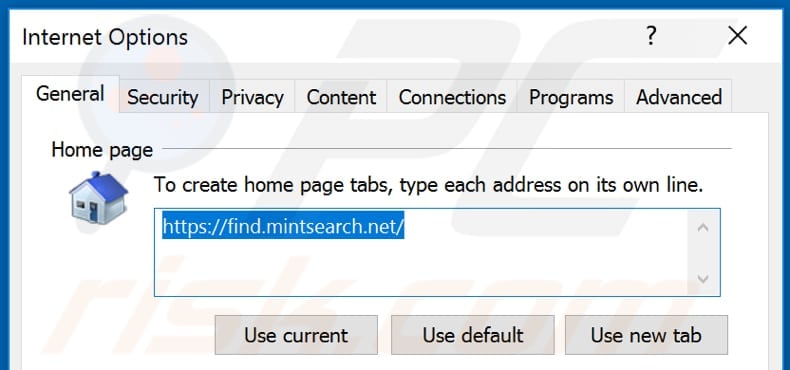 (at the top right corner of Internet Explorer), select "Internet Options", in the opened window, remove hxxp://find.mintsearch.net and enter your preferred domain, which will open each time you launch Internet Explorer. You can also enter about: blank to open a blank page when you start Internet Explorer.
