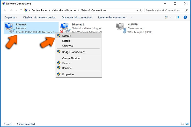 Right-click on each connection point and select "Disable". Once disabled, the system will no longer be connected to the internet. To re-enable the connection points, simply right-click again and select "Enable".