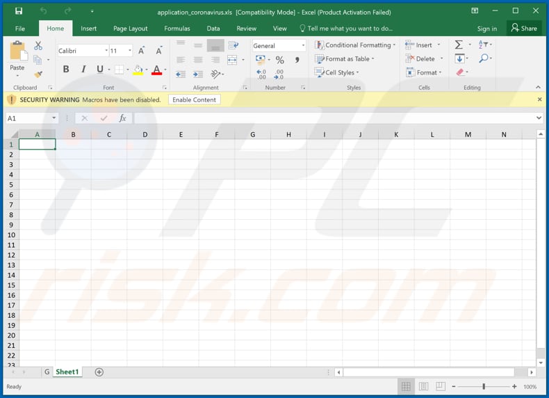 TrickBot receives permission to be installed only if recipients open the malicious Microsoft Excel document called application_coronavirus.xls (its name might vary) and enable editing/content. In fact, if this document is opened with a MS Office version that was released before 2010, it installs malware automatically, since those versions do not have "Protected View" mode, which prevents malicious documents from installing malware. More examples of files that cyber criminals attach to their emails are malicious PDF files, other MS Office documents, executable files such as .exe, archive files (ZIP, RAR), JavaScript files.