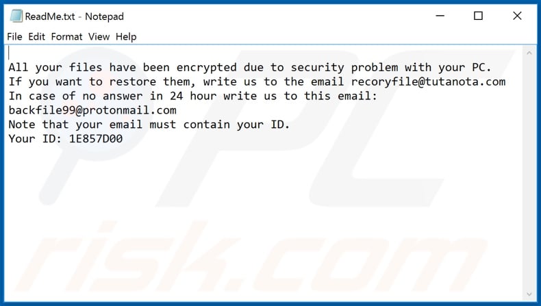 The text presented in "ReadMe.txt" informs victims that their data has been encrypted. They are instructed to initiate communication with the cyber criminals behind the infection via email. Users' messages must include the IDs assigned to them. The ransom-demand message in the pop-up window provides more information concerning the ransomware attack.