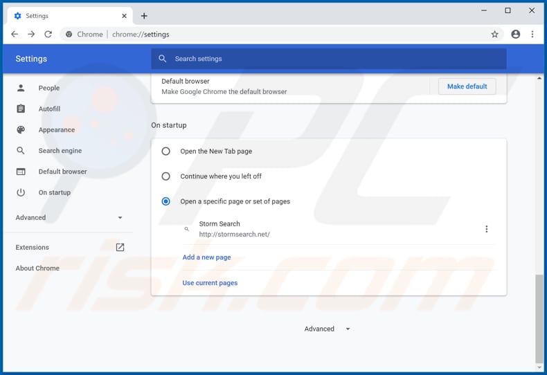 (at the top right corner of Google Chrome), select "Settings". In the "On startup" section, disable "Storm Search" (or simply "Storm"), look for a browser hijacker URL (hxxp://www.stormsearch.net) below the “Open a specific or set of pages” option. If present, click on the three vertical dots icon and select “Remove”.