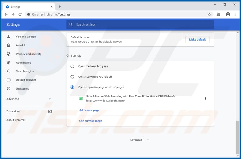 (at the top right corner of Google Chrome), select "Settings". In the "On startup" section, disable "DPS Websafe", look for a browser hijacker URL (hxxp://www.dpswebsafe.com) below the “Open a specific or set of pages” option. If present, click on the three vertical dots icon and select “Remove”.
