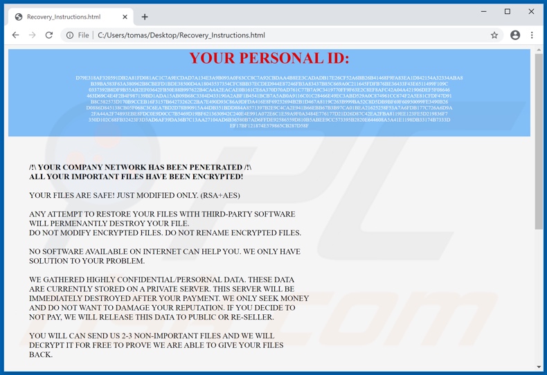 The ransom-demand message ("Recovery_Instructions.HTML") states that the victim's company network has been compromised. The files stored within the network have been encrypted with the RSA and AES cryptographic algorithms.